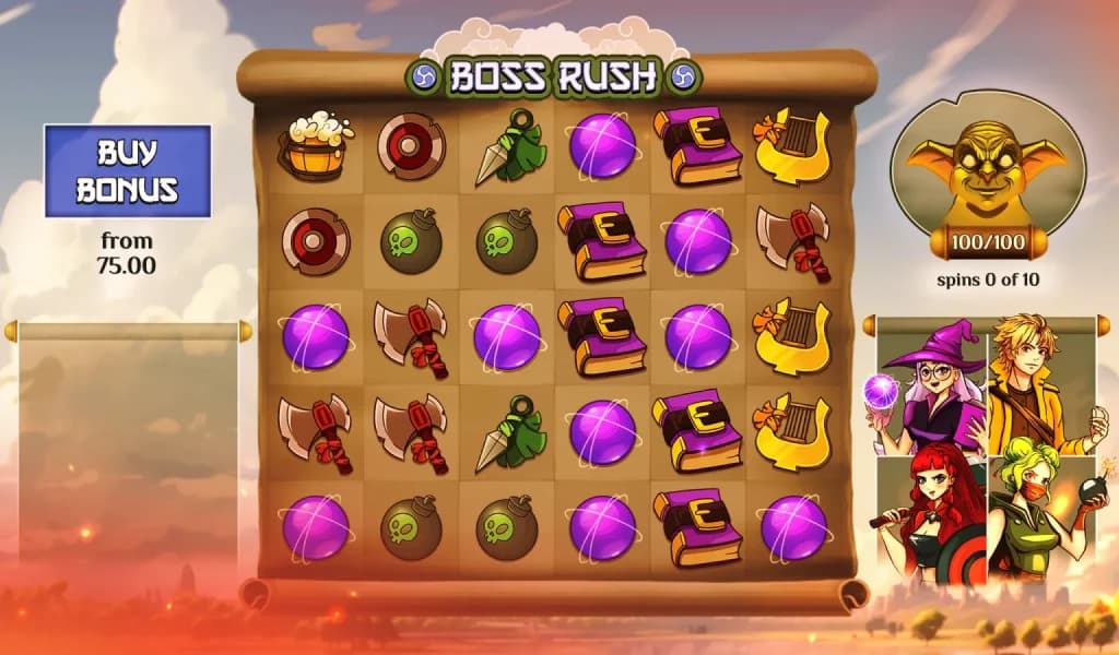 Boss Rush is a cluster pays game. 4 or more linked symbols will activate one of four heroes, who will damage the bonus boss. That is, correct combos of symbols damage the boss shown during spins. Damage is based on value of symbol and quantity of them. Players have ten spins to kill the boss and trigger a bonus. If they don’t, the boss is replaced, and a new one with a full health bar appears.