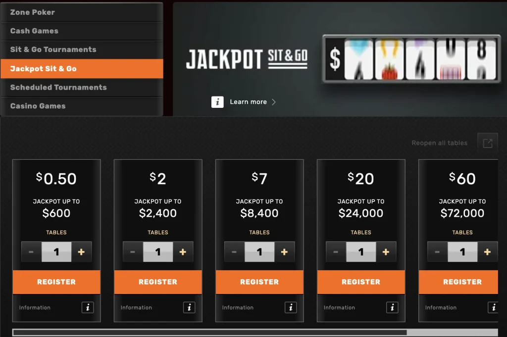 This type of tournament is played with only a few players. Each player antes up a buy in, and a random jackpot of up to 1,000x your buy in is added to the prize pool. These are super-fast poker tournaments that give you a chance to win lots of extra cash.