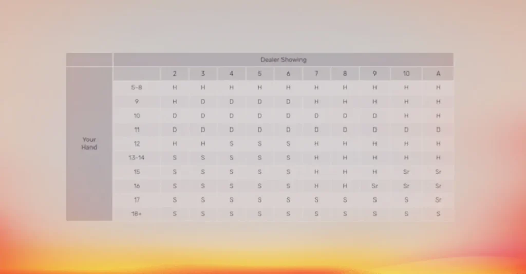 Blackjack basic strategy has to be altered a little to take into account the fact that dealer hitting no longer occurs on a soft 17. For comparison, here’s our standard blackjack strategy guide: