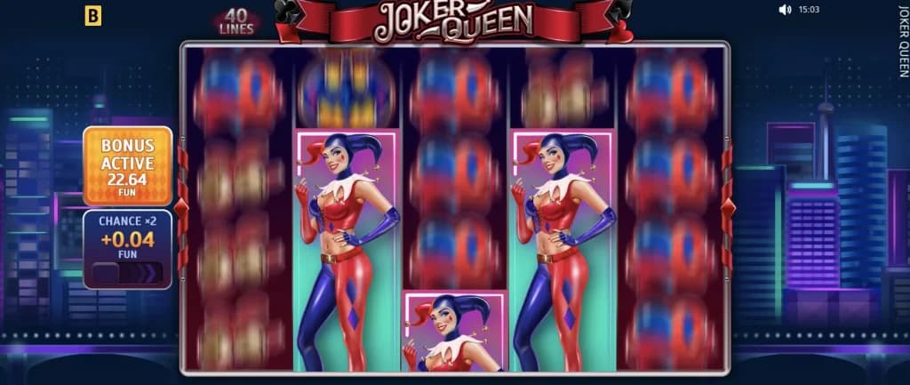 When three of the Harley Quinn-type Joker queens appear, it triggers a free respins round. These wild symbols unroll down to the bottom of the reel and then act as expanded wilds (so you want them to appear at the top of the reel for maximum expanded coverage). They then stay in place while the remaining symbols are respun for each round until the bonus game is over. The Buy Bonus button will bring up one of these rounds automatically if you don’t want to wait for the Wild Joker Queen to show up on her own schedule.