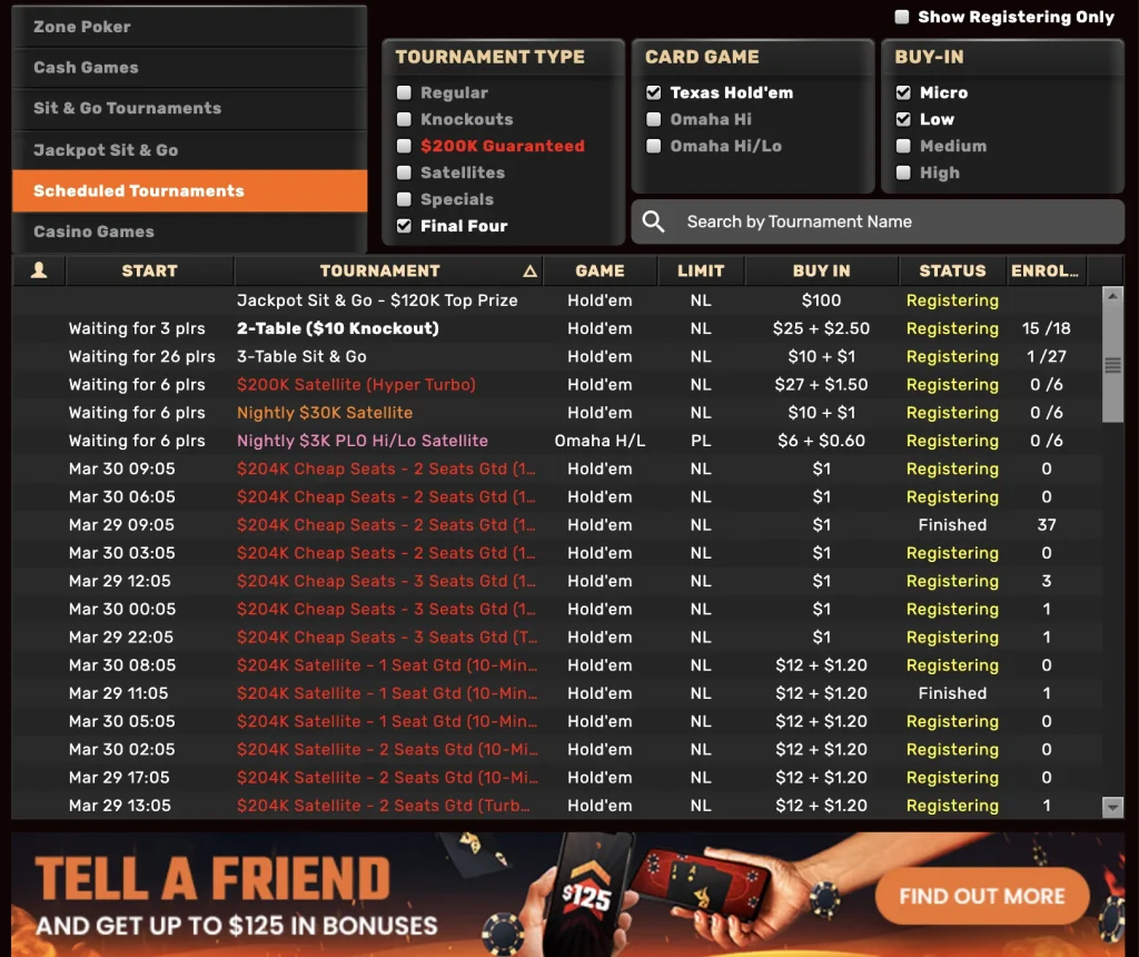 - Play your way: filter and sort tournaments using the options at the top of the tournament screen in the poker client: