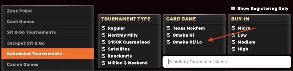 Ignition poker Omaha Hi-Lo can be found in the “Card Game” box at the top of the poker client (as shown in the image above). Just check the tick box and you’ll see games appear.