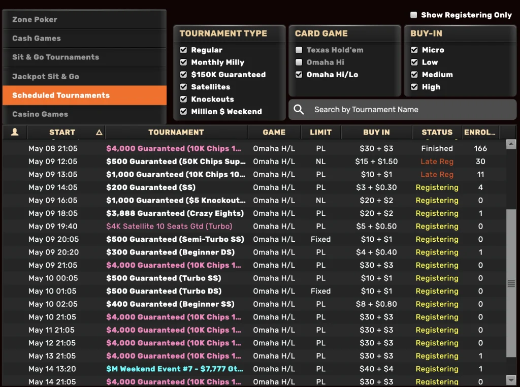 Ignition Poker Omaha Hi-Lo can also be played as a tournament. This is where you buy in and receive a ticket to battle your way to the end of a poker tourney against a field of opposing players. We’ve got Omaha H-L tournaments where you compete for a prize pool of thousands of dollars, if you’re willing to post your buy-in.