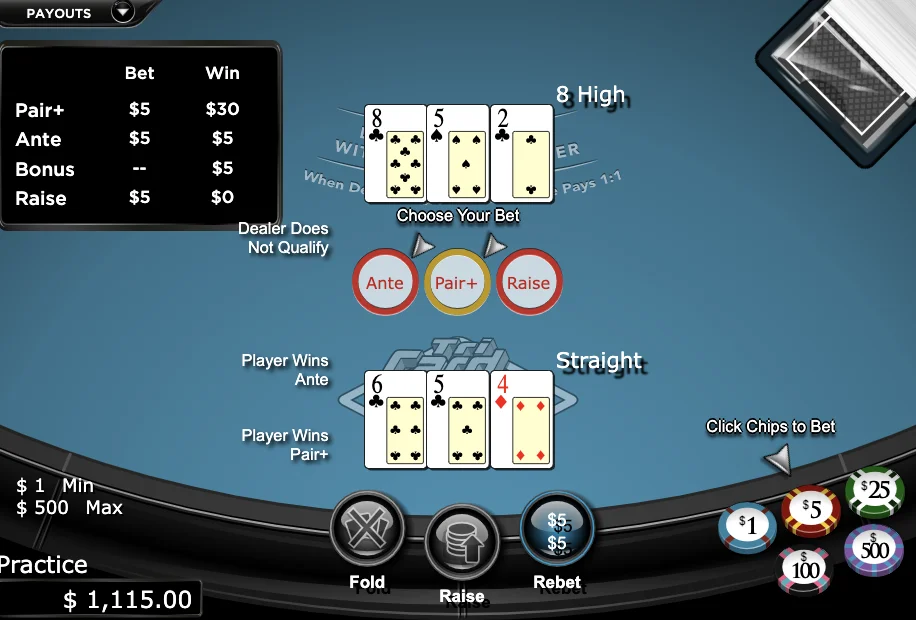 Those are the basics. But Tri Card poker also offers bonus payouts and a Pair+ bet. Let’s talk about those in the payouts section below.